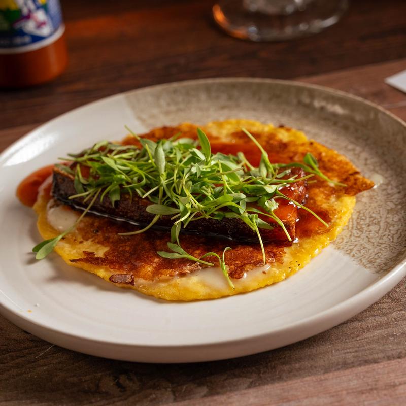 Crispy Pork Belly, Served on Cheese-Crusted Tortilla, Finished with Sriracha Agave.