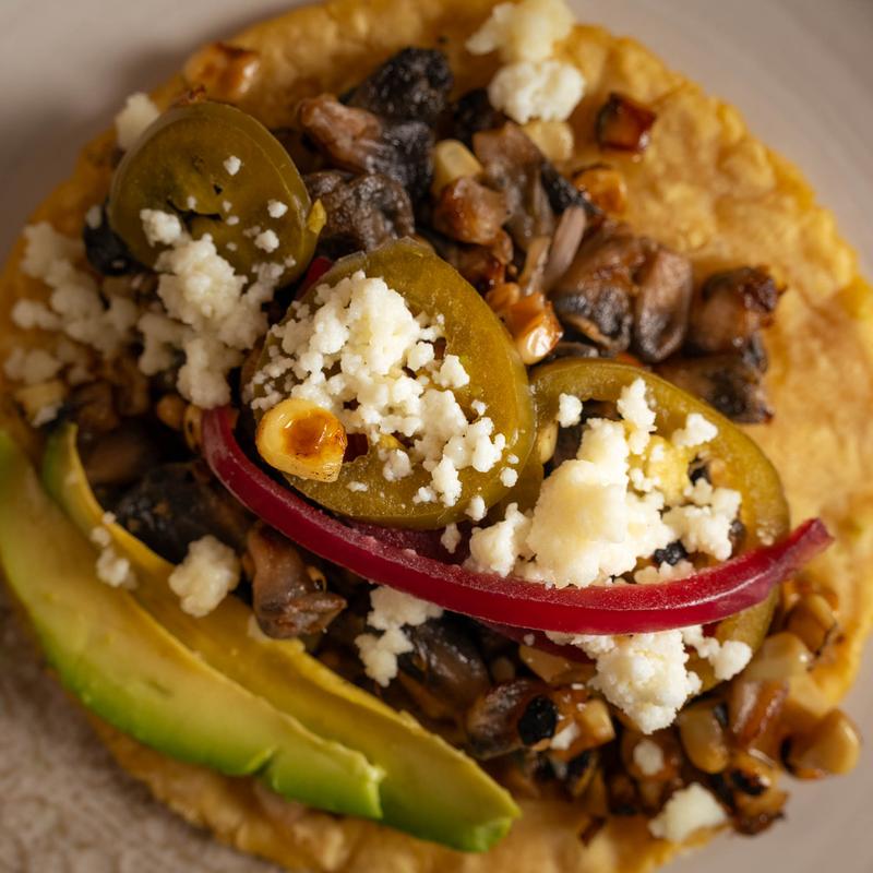 Huitlacoche Corn Mushroom, Grilled White Corn, Pickled Jalapeño & Hibiscus Red Onions, Topped with Avocado & Queso Fresco.
