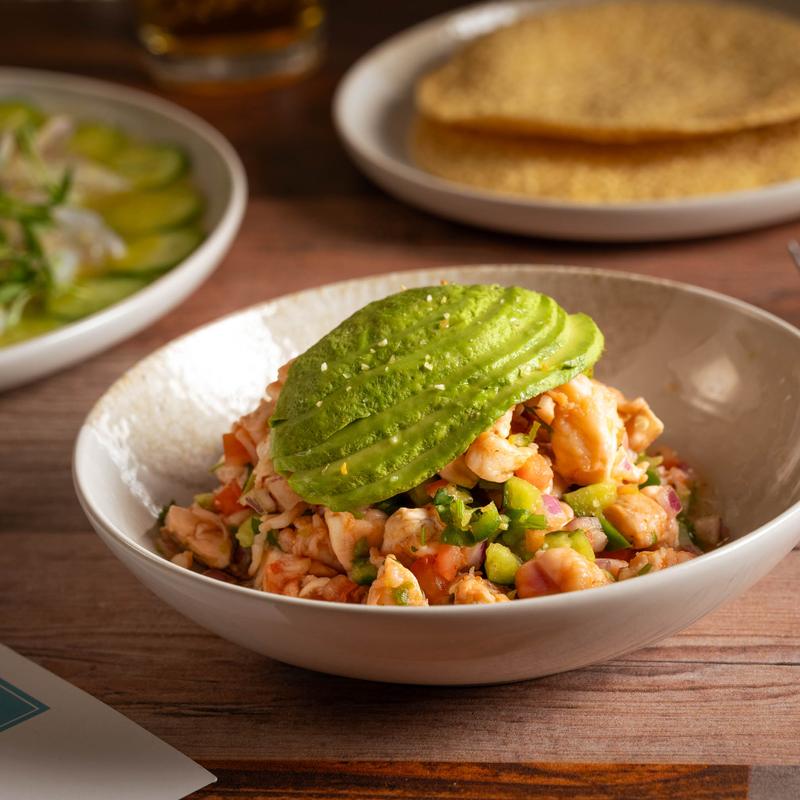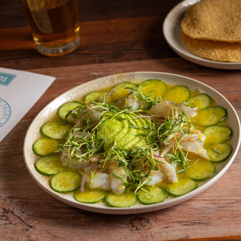 Raw Shrimp Cured in Lime, Blended Chile, Cilantro, Red Onion, Cucumber & Avocado Served with Tostadas • Choice Options: Verde, Roja, Negra.
