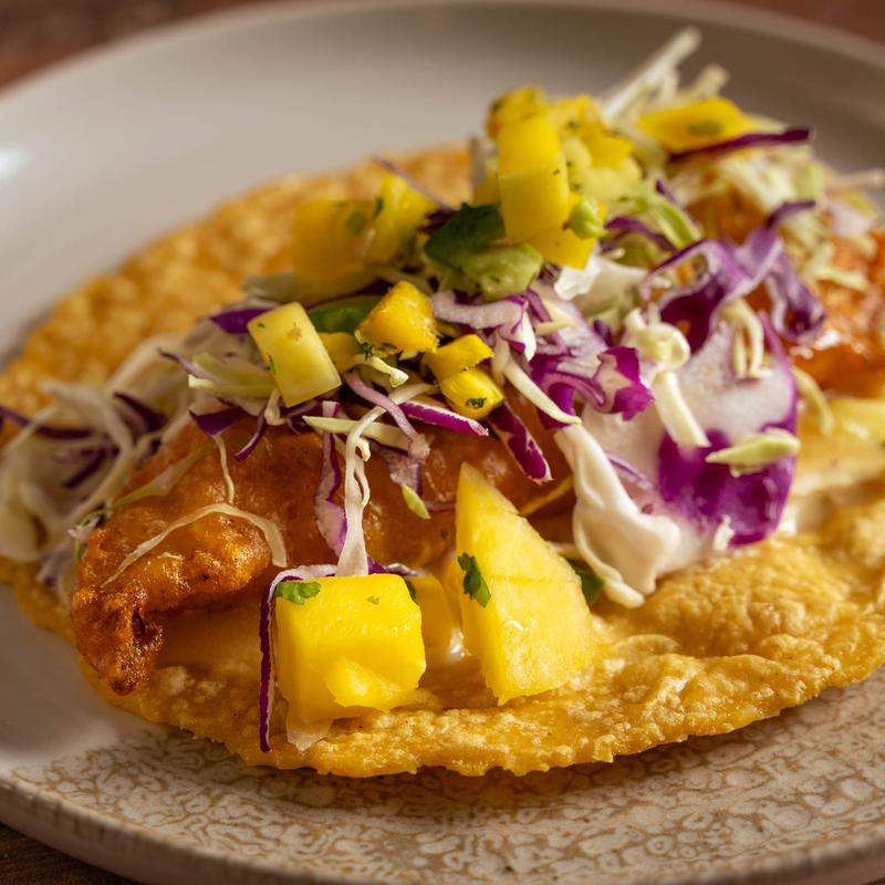 Beer-Battered Swai Fish, Shredded Cabbage, Mango Salsa & Mango Habanero Aioli.