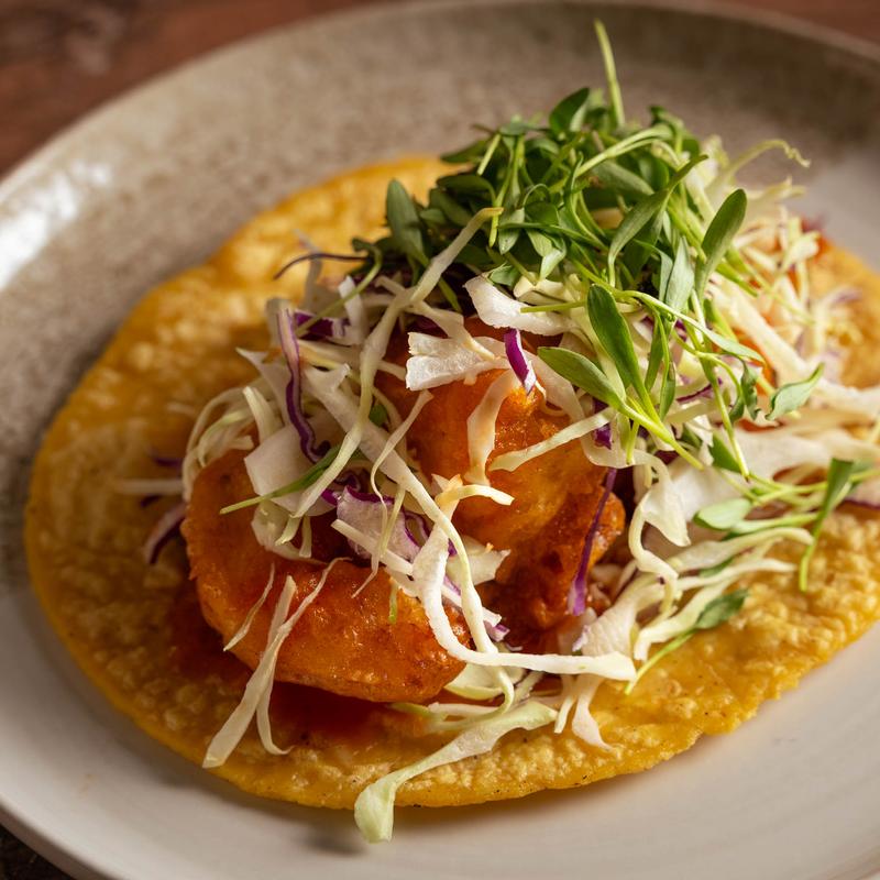 Beer-Battered Swai Fish, Lime-Cilantro Aioli, Topped with Jalapeño Slaw & Hot Honey.